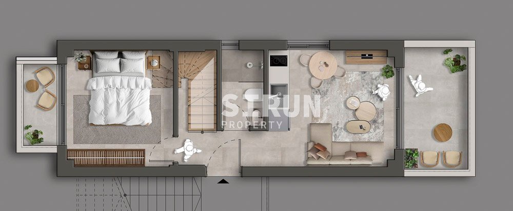 1-ый этаж: уютная гостиная с кухней открытой планировки, оснащённой бытовой техникой, и выходом на веранду, 1 спальная комната и 1 ванная комната.